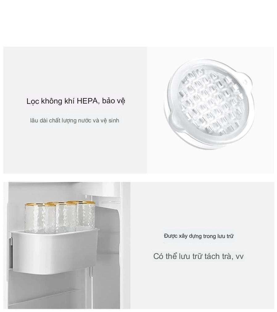 Máy nước nóng MORFUN MF809 được trang bị thiết kế snap-in 2 lớp, kết cấu vuông với thân màu trắng, vòi nước bằng hợp kim nhôm và mặt kính cường lực đen pha lê. Bình nước dự trữ sẽ được thiết kể ẩn bên trong thân máy vừa giúp bảo vệ chất lượng nguồn nước vừa mang đến tính thẩm mỹ cao hơn. Cánh cửa còn được tích hợp kệ lưu trữ có thể đặt cốc nước, khăn lau vô cùng tiện lợi. Ngoài ra, máy nước nóng MORFUN MF809 được tích hợp bộ lọc HEPA với lỗ lọc thông hơi cho hiệu quả lọc vi khuẩn, ngăn chặn các sinh vật tiếp xúc với nguồn nước uống, đảm bảo vệ sinh hơn