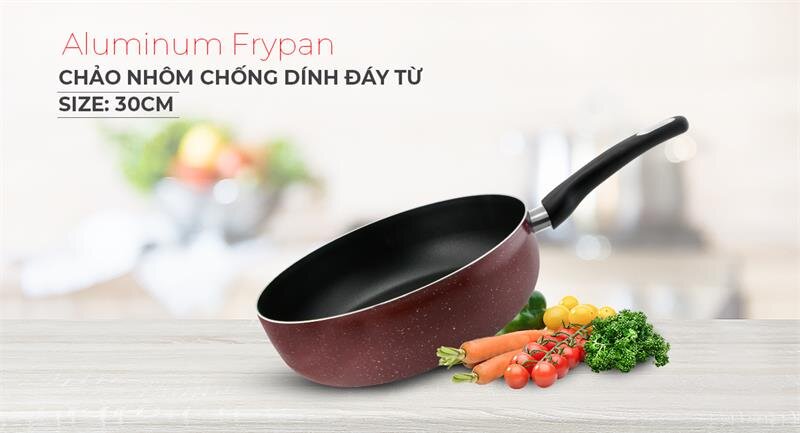 Chảo màu mận chín nổi bật kết hợp họa tiết vân đá trắng đẹp mắt tạo nên diện mạo hiện đại, tươi trẻ, làm sáng không gian căn bếp. Đường kính 30cm phổ biến, dễ sử dụng; phù hợp với nhiều cách chế biến (xào, rán, chiên,…) và nhiều loại thực phẩm khác nhau (trứng, cá, thịt, rau…)