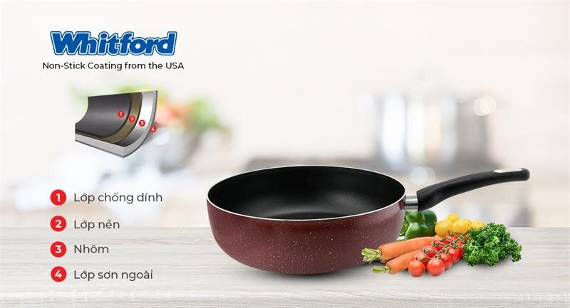 Bên ngoài chảo phủ sơn Whitford chống bám bẩn giúp dễ dàng vệ sinh, lau rửa đồng thời có khả năng chịu nhiệt đến 250 độ C