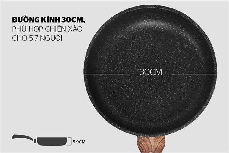 Sản phẩm có đường kính 30cm, phù hợp chiên xào cho 3-5 người. Kích cỡ hợp lý giúp bạn tối ưu lượng thức ăn và nhiên liệu sử dụng khi nấu nướng.