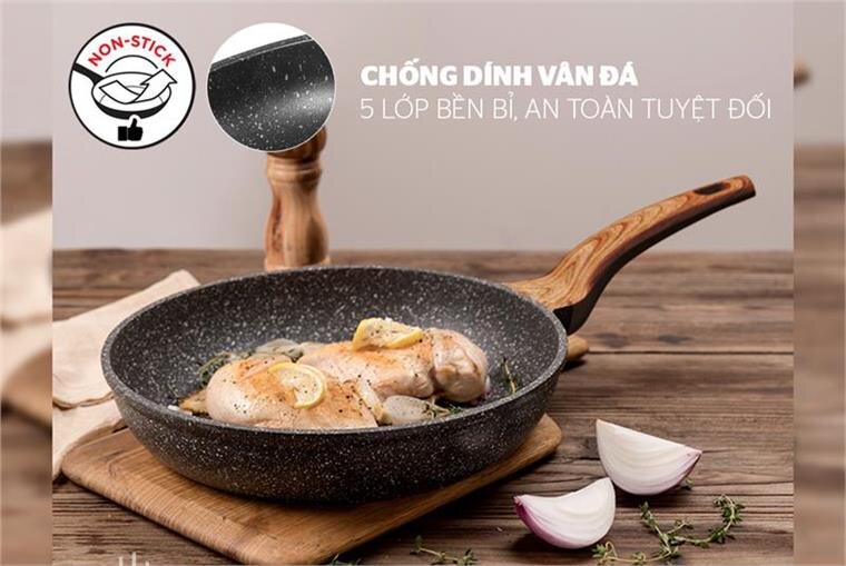 Sản phẩm sử dụng chống dính vân đá 5 lớp có độ bền bỉ tối ưu. Nhờ đó, bạn có thể giảm đi một lượng đáng kể dầu mỡ khi chiên xào mà không cần e ngại thực phẩm dính sát vào lòng chảo. Lớp chống dính dày dặn này cũng đảm bảo an toàn sức khỏe cho cả gia đình.