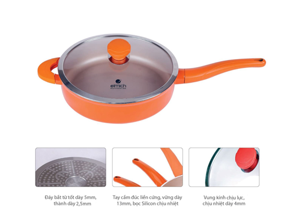 Chảo có vung kính núm Bakelite chịu lực, chịu nhiệt dày 4mm giúp dễ quan sát quá trình nấu, thức ăn chín nhanh đảm bảo vệ sinh.