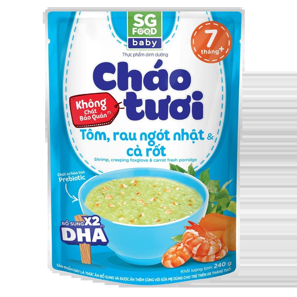 Cháo tươi baby tôm rau ngót Nhật cà rốt 240g, SG Food, 7 tháng được làm từ nguyên liệu tươi ngon, đảm bảo an toàn vệ sinh thực phẩm. Sản phẩm có hương vị thơm ngon, giàu dưỡng chất cần thiết cho sức khoẻ bé yêu.