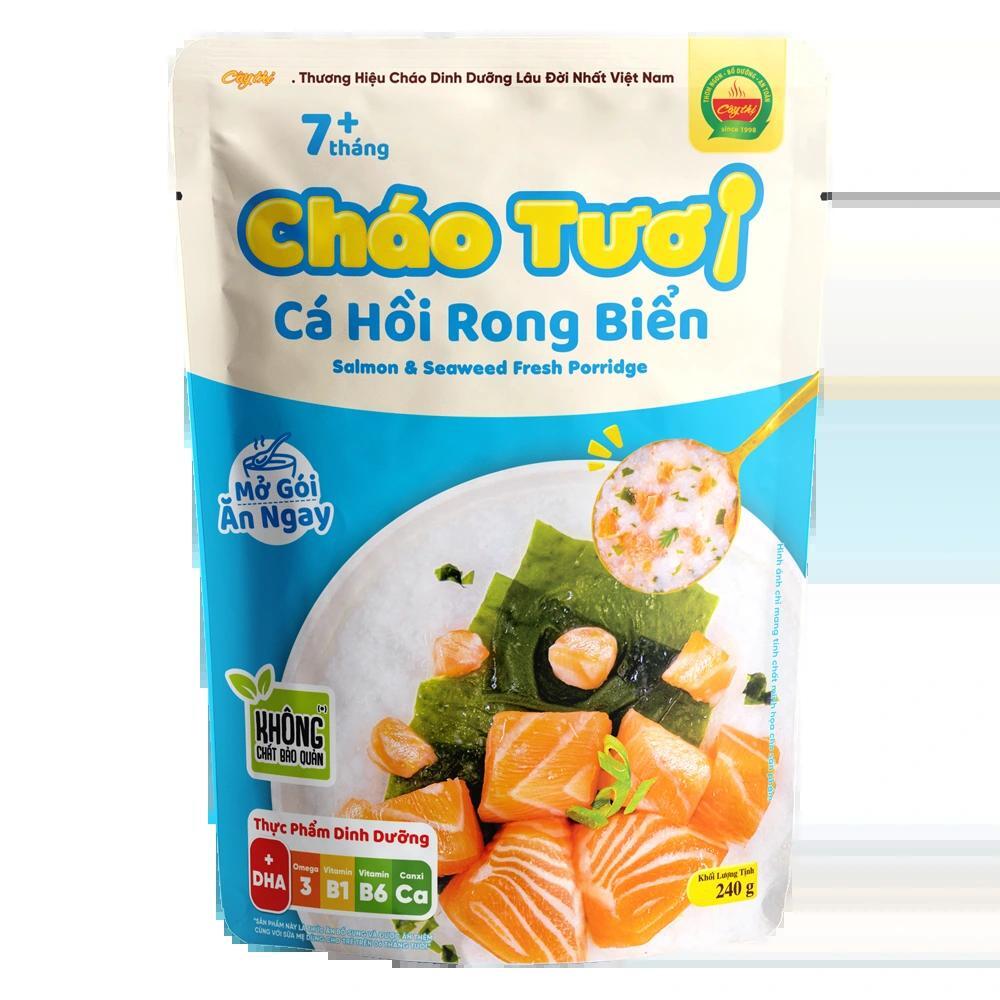 Chào Ba Mẹ, sản phẩm Cháo tươi cá hồi rong biển có thành phần sau: Nước xương hầm, Gạo tấm (10%), Thịt cá hồi (7%), Cà rốt (2%), Rong biển (1%), Thực phẩm bổ sung dầu ăn dinh dưỡng cho trẻ em nhãn hiệu Kiddy, Gừng, Tỏi, Hành lá, Muối tinh, Đường tinh luyện, Calcium carbonate, Vitamin B1 (Thiaminchloride hydrochloride), Vitamin B6 (Pyridoxine hydrochloride). Cảm ơn Ba Mẹ