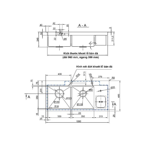 • Kích thước cả chậu (mm): 1000 x 490 x 240