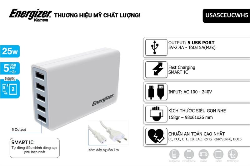Sạc 5A 25W Energizer CL 5USB – Sạc cùng lúc cho 5 thiết bị khác nhau, công nghệ hiện đại, an toàn.