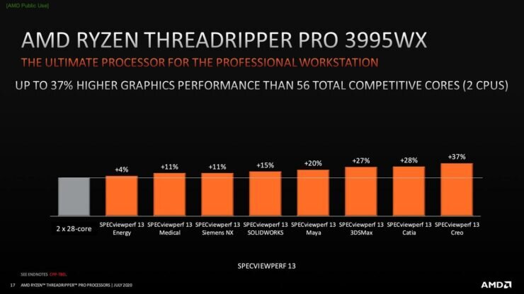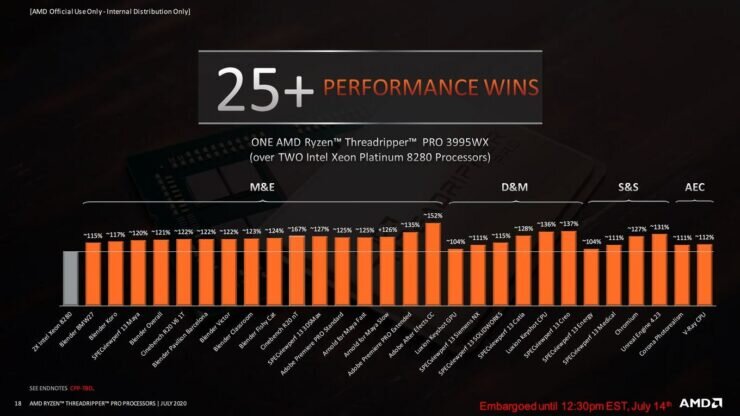 Một ví dụ nhỏ khi so sánh với đối thủ đầu bảng cùng đẳng cấp, Xeon W3275 dựa trên kiến trúc Cascade Lake 14nm có 28 lõi và 56 luồng, quá ít ỏi so với 64 lõi và 128 luồng của AMD 3995WX. Xung nhịp 4,2 GHz của AMD phát huy hiệu quả hơn khi nền tảng này sở hữu tối đa lên đến 64 lõi.