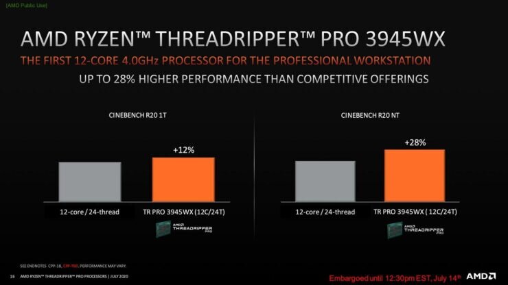 Một ví dụ nhỏ khi so sánh với đối thủ đầu bảng cùng đẳng cấp, Xeon W3275 dựa trên kiến trúc Cascade Lake 14nm có 28 lõi và 56 luồng, quá ít ỏi so với 64 lõi và 128 luồng của AMD 3995WX. Xung nhịp 4,2 GHz của AMD phát huy hiệu quả hơn khi nền tảng này sở hữu tối đa lên đến 64 lõi.