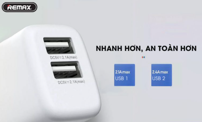 Tích hợp 2 cổng USB 2.4A Dù sở hữu thiết kế nhỏ gọn nhưng củ sạc Remax RP-U36 vẫn được trang bị 2 cổng USB cho phép sạc cùng lúc 2 thiết bị nhanh chóng và an toàn. Hai đầu của củ sạc chuẩn 2.4A tương thích với nhiều thiết bị khác nhau.  Tự động điều chỉnh dòng điện Được trang bị chip sạc thông minh nên RP-U36 có khả năng tự động điều chỉnh dòng điện phù hợp với mọi thiết bị di động. Nhờ khả năng tự nhận diện và điều chỉnh này mà quá trình sạc sẽ diễn ra ổn định hơn, bảo vệ tuổi thọ pin cho thiết bị của bạn.