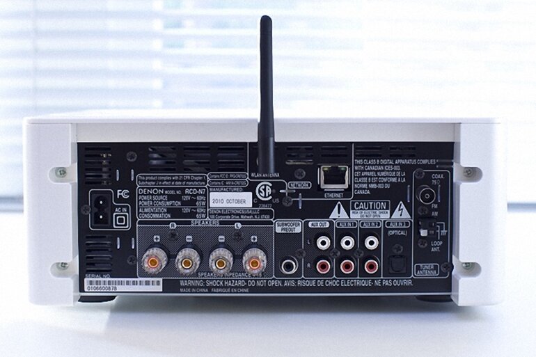 Mặt sau thiết bị có 3 ngõ vào: 2 ngõ RCA và 1 ngõ cáp quang (Optical). Như vậy, có thể kết nối ngõ âm thanh ra từ đầu phát Bluray/DVD hoặc CD vào các cổng này để nghe nhạc trên đôi loa của SC-N7. Dàn mini Denon N7 cũng có ngõ cắm tai nghe giắc 3,5mm.