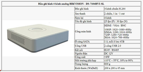 Thông số kỹ thuật của đầu ghi hình Hikvision DS-7104HVI-SL