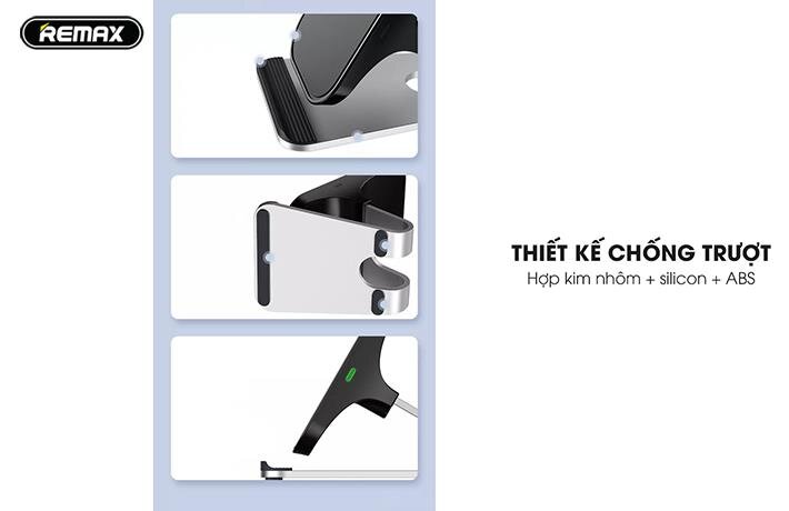 Đế sạc không dây kiêm giá đỡ điện thoại Remax RP-W12 được cấu tạo từ hợp kim nhôm + Slicon + ABS mang đến một thiết kế hoàn hảo và sang trọng. Tại phần chân giá đỡ của đế sạc dự phòng được thiết kế chống trượt bằng chất liệu những lớp phủ silicon. Dù bạn có để điện thoại nghiêng cũng không lo máy bị trượt ra ngoài. Hay khi để giá đỡ lên bề mặt phẳng và trơn như kính, những lớp đệm silicon nhỏ ở dưới chân giá đỡ sẽ giúp bám dính chắc chắn hơn.