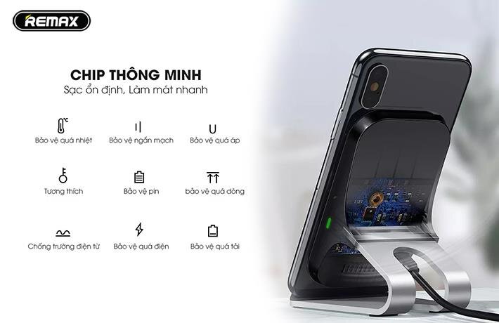An toàn với chip thông minh Remax RP-W12 là phụ kiện sạc cho thiết bị di động, vì vậy nhà sản xuất đã trang bị thêm cho sản phẩm chip thông minh có tác dụng hỗ trợ sạc nhanh, sạc ổn định kết hơp làm mát không gây nóng máy. Khi sử dụng, người dùng hoàn toàn yên tâm bởi hệ thống bảo vệ toàn diện sau đây Bảo vệ quá nhiệt Bảo vệ ngắn mạch Bảo vệ quá áp Bảo vệ pin Bảo vệ quá dòng Bảo vệ quá điện Bảo vệ quá tải Chống trường điện từ Khả năng tương thích rộng rãi