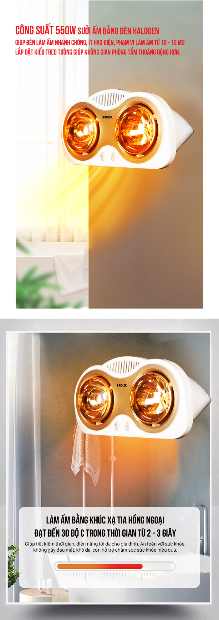 Công suất 550W, sưởi ấm bằng đèn Halogen Đèn sưởi treo tường Roler RL- 2114 công suất 550W, sưởi ấm bằng đèn Halogen giúp đèn làm ấm nhanh chóng, ít hao điện, phạm vi làm ấm từ 7 -10 m2. Làm ấm bằng khúc xạ tia hồng ngoại đạt đến nhiệt độ 30 độ C trong thời gian từ 2 - 3 giây. Giúp tiết kiệm thời gian, điện năng tối đa cho gia đình. Đặc biệt, đèn an toàn với sức khỏe, không gây đau mắt, khô đa, còn hỗ trợ chăm sóc sức khỏe hiệu quả. Lắp đặt kiểu treo tường giúp không gian phòng tắm thoáng rộng hơn.