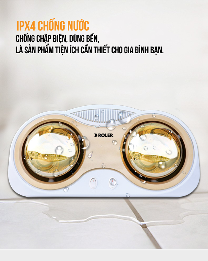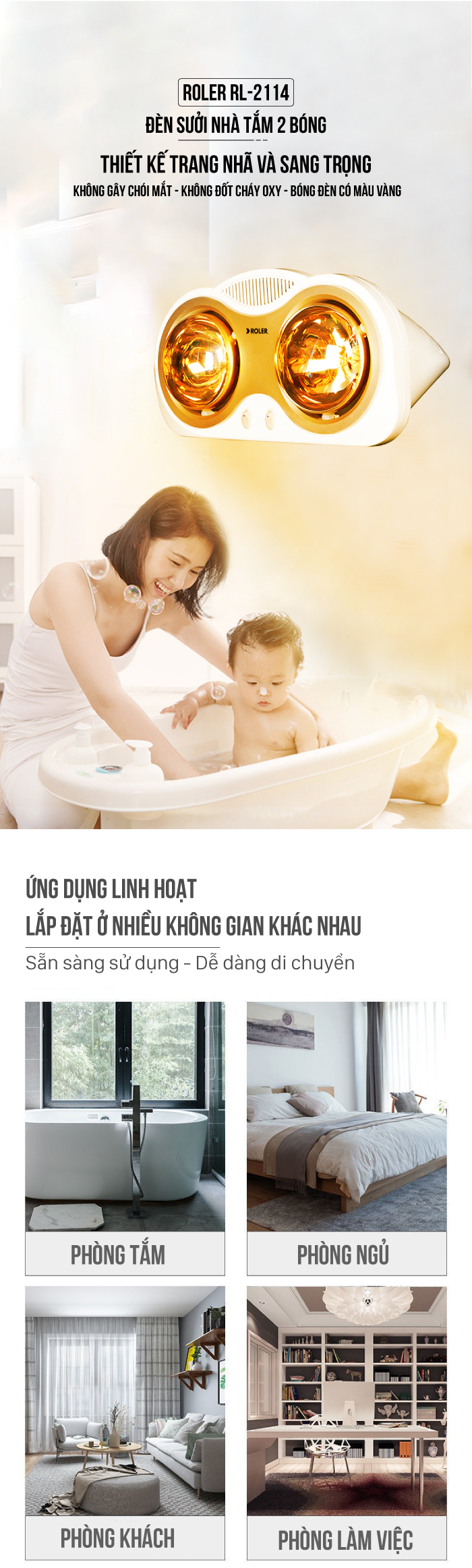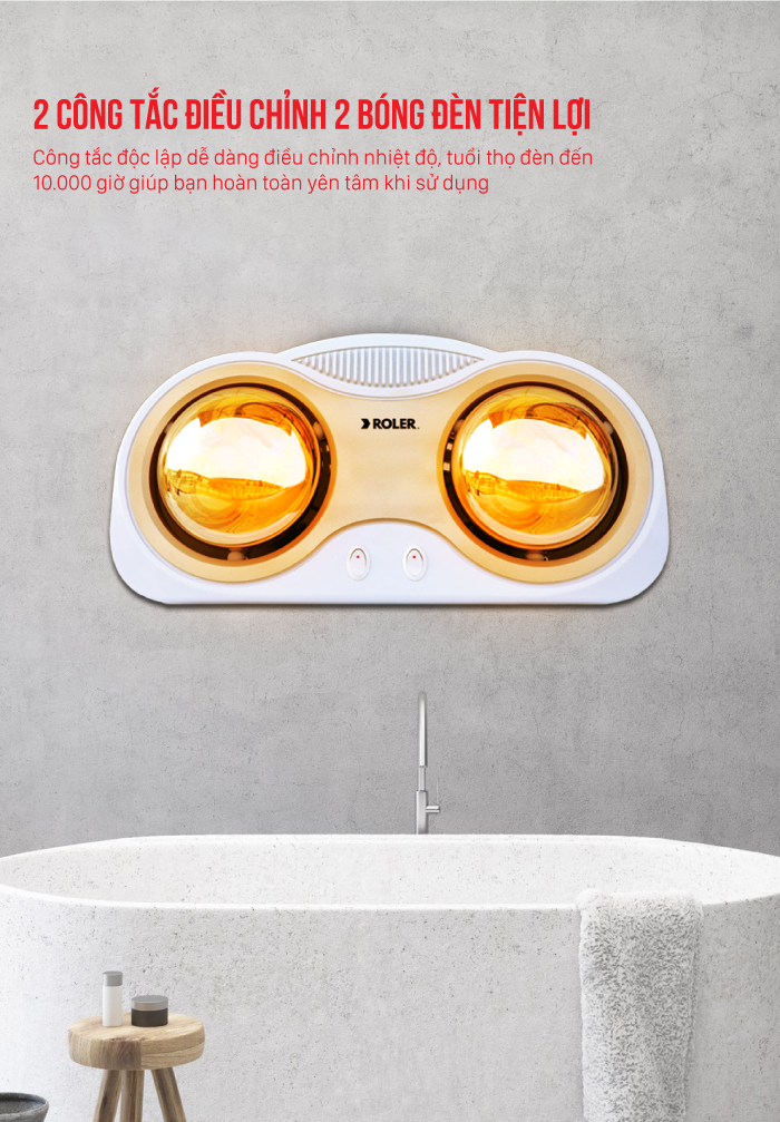 Thiết kế trang nhã và sang trọngĐèn sưởi nhà tắm với thiết kế trang nhã và sang trọng, lại là loại đèn treo tường để tăng hiệu quả làm ấm nên đèn có thể lắp đặt linh hoạt tại tất cả các phòng như phòng khách, phòng ngủ, phòng tắm hay phòng bếp tùy theo nhu cầu của bạn. Mỗi bóng đèn có công tắc riêng và có nắp đậy chống nước giúp bạn hoàn toàn yên tâm vệ độ an toàn khi sử dụng. Đèn sưởi treo tường Roler RL- 2114 sử dụng 2 bóng không gây chói mắt, không đốt cháy oxy, bóng đèn có màu vàng. Với khả năng làm ấm bằng khúc xạ tia hồng ngoại đây là sản phẩm an toàn chất lượng tốt trên thị trường hiện nay.