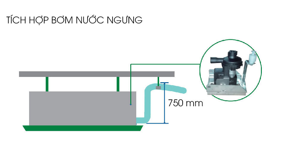 Trên dàn lạnh điều hòa âm trần Nagakawa inverter NIT-C28R2T35 được trang bị bơm thoát nước ngưng tụ áp suất đẩy lên tới 750mm. Dễ dàng lắp đặt đường ống trong mọi điều kiện không gian, đặc biệt thích hợp cho các phòng có trần treo thấp.