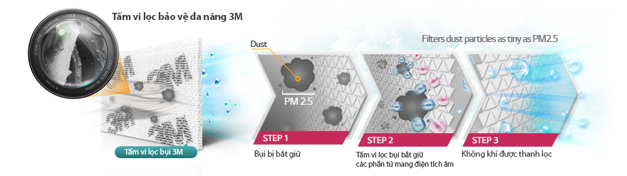 Chức năng tự đông làm sạch giúp hong khô dàn tản nhiệt để ngăn chặn các vi khuẩn và nấm mốc phát triển. Không chỉ vậy, Ion tăng cường giúp loại bỏ mùi khó chịu từ điều hòa, đem đến cho bạn không khí trong lành. TẤM VI LỌC BẢO VỆ ĐA NĂNG 3M