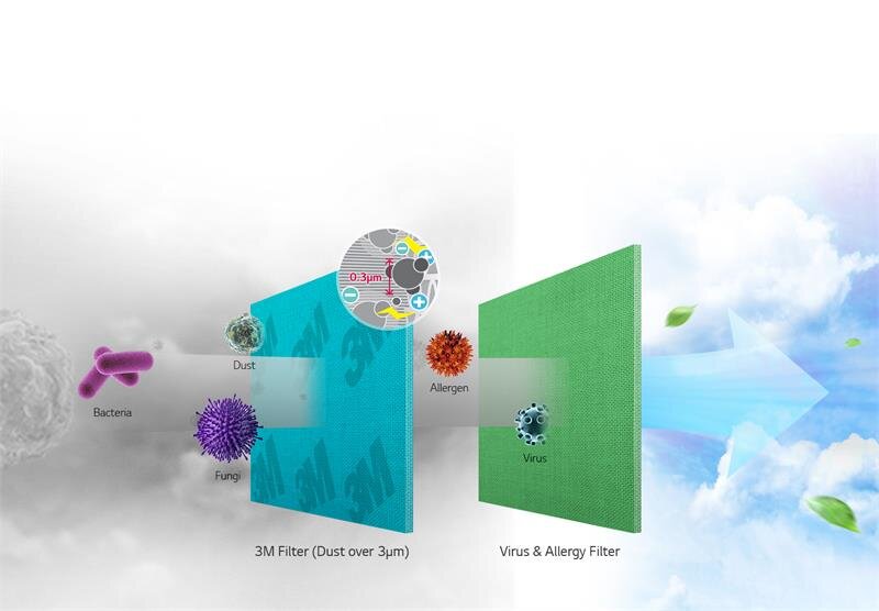 Các công nghệ tiên tiến của 3M và LG loại bỏ các vi hạt có hại bao gồm virus, vi khẩn và chất gây dị ứng nhằm cung cấp môi trường an toàn hơn, lành mạnh hơn.