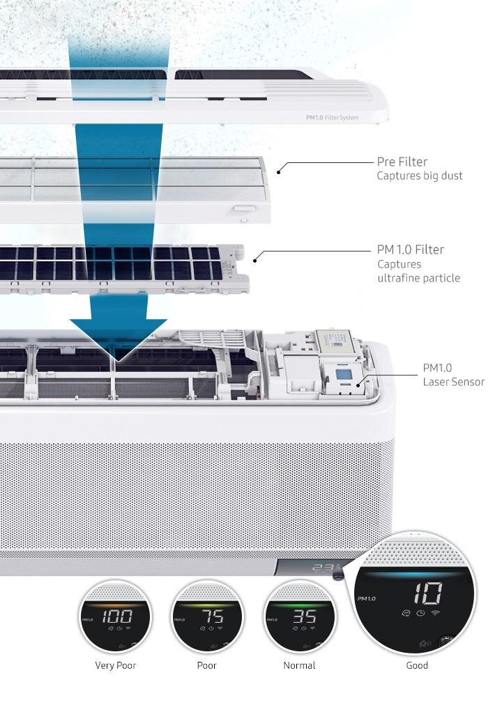 Bộ lọc PM 1.0 lọc sạch hiệu quả bụi siêu mịn, giữ cho không khí trong lành. Đèn màu báo hiệu chất lượng không khí và cảm biến laser cảnh báo mức độ ô nhiễm. Thiết kế bộ lọc dễ dàng rửa sạch và bảo trì.