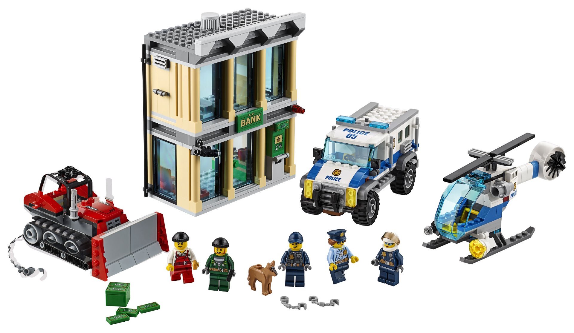 - 4 mô hình lắp ghép chính bao gồm: Tòa nhà ngân hàng, máy bay trực thăng cảnh sát, xe tải cảnh sát và xe ủi của tội phạm.