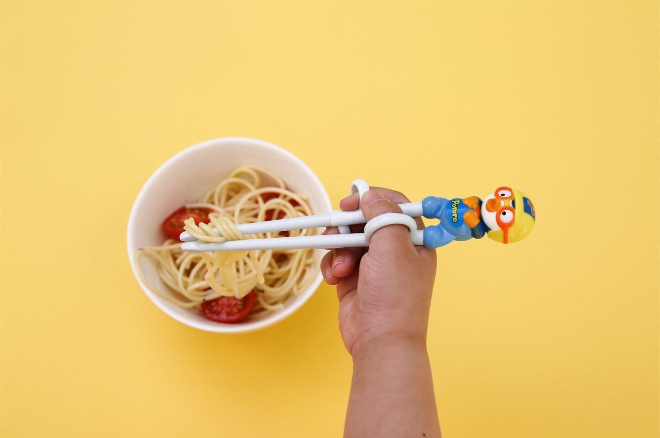 - Đũa tập ăn Edison Pororo (tay phải) giúp bé dễ dàng cầm nắm và tập dùng đũa để gắp thức ăn