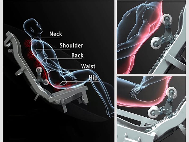 Hệ thống túi khí được bố trí toàn thân ghế từ đầu, vai, lưng, mông và chân áp dụng công nghệ nén khí tiên tiến giúp loại bỏ sự mệt mỏi và tăng cường tuần hoàn máu khắp cơ thể.