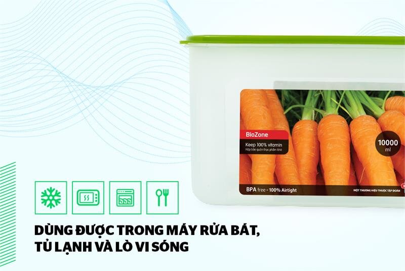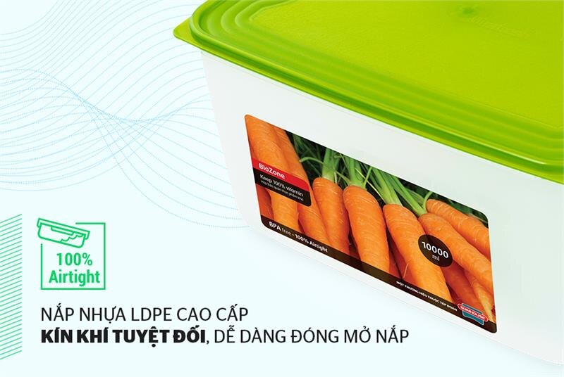Chất liệu nhựa PP còn có tính chất chống thấm O2, hơi nước, dầu mỡ và các khí khác nên giữ được hương vị tươi nguyên nhất của thực phẩm cũng như tránh làm bay mùi ra tủ lạnh (đặc biệt các loại thực phẩm có mùi như cá khô) Nhỏ gọn, tiết kiệm diện tích Với thiết kế hộp chữ nhật nhỏ gọn, dung tích 10000ml, hộp có khả năng bảo quản được một lượng rất lớn thực phẩm khô, giúp bạn sắp xếp thực phẩm ngăn nắp, gọn gàng.