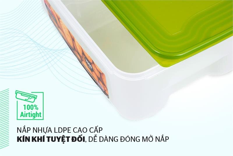 Nắp nhựa dẻo với độ co phù hợp, kín khít miệng hộp nên dù không có gioăng silicon thì vẫn  kín khí tuyệt đối. Điều này vô cùng quan trọng trong việc bảo quản thực phẩm khô, các loại hạt…  4 góc nhám chống xước & thiết kế lõm hai bên sườn Hộp được thiết kế thông minh với 4 góc nhám chống xước, kết hợp vùng lõm hai bên sườn tạo rãnh cầm, dễ dàng thao tác.