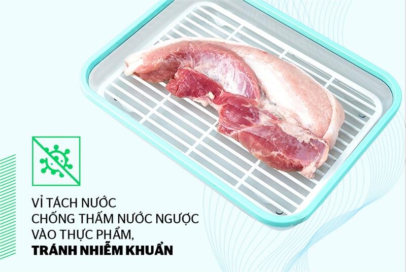 Với thiết kế vỉ tách nước tiện lợi, lượng nước còn lưu lại trong thực phẩm (thịt, cá, hải sản…) sau khi được đưa vào hộp sẽ chảy xuống lòng hộp bên dưới thay vì thấm ngược vào thực phẩm, giữ độ ẩm vừa phải. Việc này không những giúp tránh nhiễm khuẩn, biến chất thực phẩm mà việc rã đông cũng nhanh hơn do không có nhiều nước tích tụ bị làm đông.  Nhỏ gọn, tiết kiệm diện tích