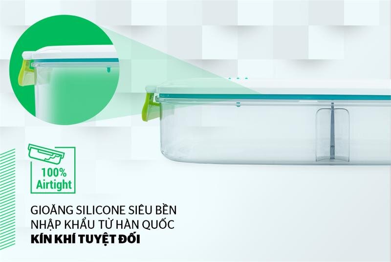 Gioăng hộp làm từ silicone, cấu tạo 2 lớp (khác biệt so với các loại thường chỉ có 1 lớp), ở giữa là không khí rỗng, có thể tháo rời khỏi nắp hộp. Đặc biệt, gioăng hộp chịu nhiệt tới 200 độ C, đàn hồi cực tốt giúp cho hộp kín hơi, không lo tràn nước.