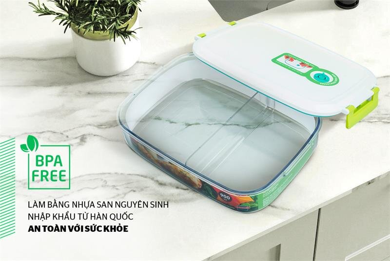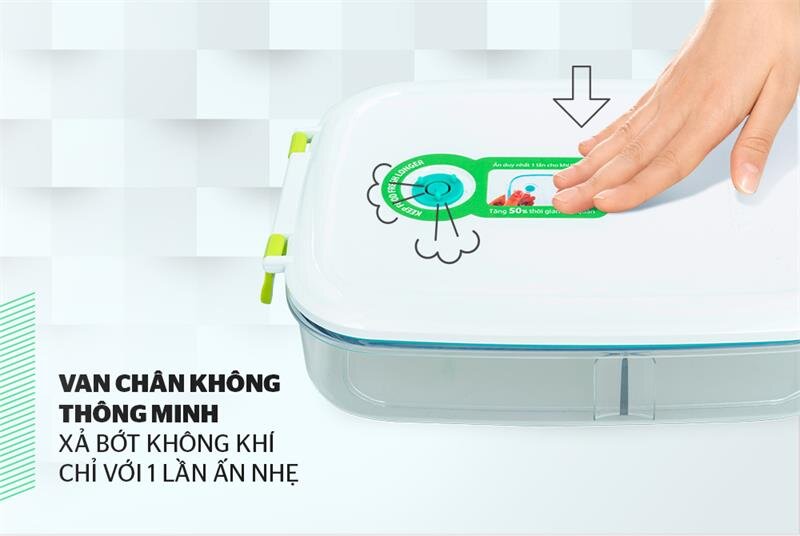 Van silicone trên nắp hộp có tác dụng xả bớt không khí trong hộp chỉ với một lần ấn nhẹ, giúp giảm độ ẩm và tốc độ oxi hóa, ngăn ngừa thất thoát vitamin, giữ nguyên độ tươi ngon của thực phẩm.