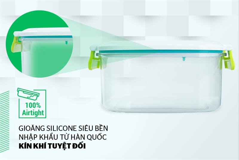 Van silicone trên nắp hộp có tác dụng xả bớt không khí trong hộp chỉ với một lần ấn nhẹ, giúp giảm độ ẩm và tốc độ oxi hóa, ngăn ngừa thất thoát vitamin, giữ nguyên độ tươi ngon của thực phẩm.