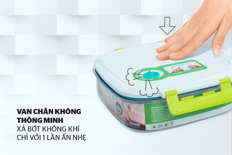 Van silicone trên nắp hộp có tác dụng xả bớt không khí trong hộp chỉ với một lần ấn nhẹ, giúp giảm độ ẩm và tốc độ oxi hóa, ngăn ngừa thất thoát vitamin, giữ nguyên độ tươi ngon của thực phẩm.