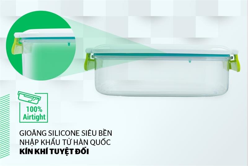 Gioăng hộp làm từ silicone, cấu tạo 2 lớp (khác biệt so với các loại thường chỉ có 1 lớp), ở giữa là không khí rỗng, có thể tháo rời khỏi nắp hộp. Đặc biệt, gioăng hộp chịu nhiệt tới 200 độ C, đàn hồi cực tốt giúp cho hộp kín hơi, không lo tràn nước.