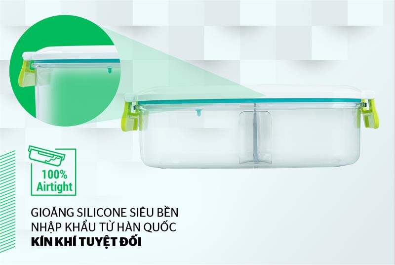 Gioăng hộp làm từ silicone, cấu tạo 2 lớp (khác biệt so với các loại thường chỉ có 1 lớp), ở giữa là không khí rỗng, có thể tháo rời khỏi nắp hộp. Đặc biệt, gioăng hộp chịu nhiệt tới 200 độ C, đàn hồi cực tốt giúp cho hộp kín hơi, không lo tràn nước.