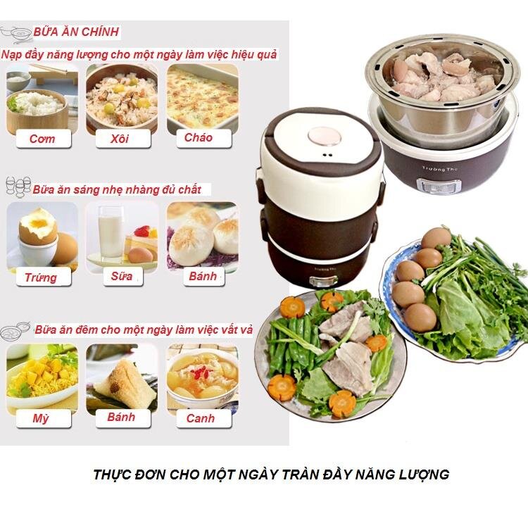ĐẶC ĐIỂM NỔI BẬT Chất liệu cao cấp, an toàn sức khỏe Hộp cơm điện 3 tầngTrường Thọ BA 2019A được thiết kế từ chất liệu inox 304 và nhựa PP cao cấp nên sở hữu độ bền cao, hạn chế bị biến dạng khi có va chạm, vì thế bạn có thể yên tâm sử dụng sản phẩm trong thời gian lâu dài. Ngoài ra, chất liệu trên còn giúp chiếc hộp không bị gỉ sét và hoàn toàn không chứa các chất độc hại khi sử dụng lâu ngày, đảm bảo an toàn cho sức khỏe của bạn và người thân trong gia đình.Dẫn nhiệt và giữ nhiệt tốt Với tính năng dẫn nhiệt tốt và nhanh, hộp cơm điện 3 tầngTrường Thọ BA 2019Alàm cho thức ăn chín đều giúp công việc chế biến thức ăn trở nên nhanh chóng mà vẫn giữ nguyên hương vị thơm ngon của thức ăn. Ngoài ra, sản phẩm còn giúp bảo quản và giữ nhiệt tốt vì thế bạn có thể thưởng thức thức ăn sau một thời gian để lâu trong hộp mà vẫn cung cấp những thức ăn nóng như vừa mới chế biến. Kiểu dáng hiện đại Hộp cơm điện 3 tầngTrường Thọ BA 2019A có kích thước nhỏ gọn vì thế bạn có thể mang sản phẩm đến bất cứ nơi nào để sử dụng, tạo sự linh hoạt và cơ động nhất, sản phẩm phù hợp để bạn mang theo đi dã ngoại hay có buổi tiệc ngoài trời. Không những thế, với kiểu dáng hiện đại, hộp cơm còn góp phần mang đến sự cá tính và sang trọng cho người sử dụng. Thiết kế thông minh Hộp cơm điện 3 tầngTrường Thọ BA 2019A là sự kết hợp độc đáo của nhiều chức năng vào trong cùng một sản phẩm như: nấu cơm, luộc trứng, nấu canh,... mang lại sự tiện lợi và nhanh chóng chưa từng có trong việc nấu nướng. Với thiết kế hình trụ tròn có 1 tầng, sản phẩm cho sức chứa tối đa lên tới 2 lít, đảm bảo cung cấp không gian chứa thức ăn cần thiết cho nhiều người ăn giúp bạn tiết kiệm thời gian hiệu quả thay vì phải nấu nhiều lần. An toàn khi sử dụng Vì được thiết kế sử dụng điện để hoạt động nên hộp cơm điện 3 tầngTrường Thọ BA 2019A sẽ giúp hạn chế các sự cố do lửa gây ra, tạo sự an toàn tuyệt đối cho người sử dụng. Sản phẩm còn được trang bị khả năng kiểm soát nguồn điện, góp phần hạn chế các sự cố về điện xảy ra trong quá trình sử dụng. Hướng dẫn sử dụng Nồi cơm văn phòng đa năng 3 tầng: 1.a, Nấu thức ăn: Lấy cốc nước đổ vào thân nồi theo một liều lượng khoảng(60ml) để hâm nóng.(cụ thể tham khảo bảng follwing) Cho các thực phẩm và thức ăn cần hâm nóng vào lòng nồi hay khay đựng thức ăn rùi đẩy nắp nồi lên. Tiếp theo căm ngồn điện, bật công tác và chờ thời gian khoảng 15- 20 phút. 1.b, Nấu Cơm: Lấy cốc nước đổ vào thân nồi theo một liều lượng khoảng(60ml) để nấu ăn.(cụ thể tham khảo bảng follwing), Cho lượng gạo chưa nấu chín và lượng nước vào lòng nồi nấu(cụ thể tham khảo bảng follwing). Sau đó đặt lòng nồi nấu lên thân nồi lại với nhau, sau đó đậy nắp nồi lên. Tiếp theo căm ngồn điện, bật công tác và chờ thời gian khoảng 30 - 35 phút. 1.c, Nguyên lý hoạt động: Sau khi nước trong thân nồi khô hết, nó sẽ tự động tắt nguồn, đèn làm việc tắt. Có nghĩa là đã được nấu chín hay hâm nóng Thêm nước và bảng thời gian tham khảo (cung cấp chỉ để tham khảo, bạn có thể điều chỉnh theo kinh nghiệm) Bảng Tham Khảo: