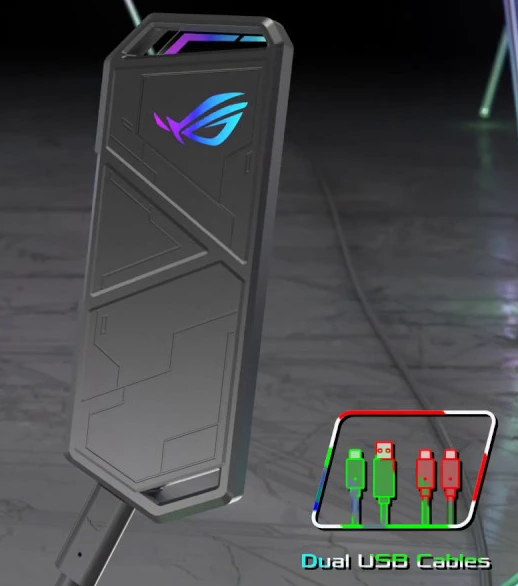 Box ổ cứng di động Asus ROG Strix Arion là thiết bị giúp bạn có thể đọc và biến ổ cứng SSD chuẩn M.2 NVMe PCIe tốc độ cao thành một ổ cứng SSD di động để bạn có thể chuyển dữ liệu từ ổ cứng cũ sang ổ cứng mới khi nâng cấp SSD M.2 NVMe PCIe trong máy, hoặc mang dữ liệu của bạn đến bất kì đâu bạn muốn với tốc độ băng thông lên đến 10Gbps, giúp tiết kiệm cho bạn rất nhiều thời gian. Sản phẩm được trang bị chuẩn đầu ra là USB Type-C 3.2 Gen 2 kèm theo cáp chuyển từ USB Type-C sang USB Type-A giúp bạn sử dụng trên các thiết bị có cổng USB Type-A, ngoài ra Box ổ cứng di động Asus ROG Strix Arion được kèm thêm cable Type-C sang Type-C để bạn dễ dàng kết nối với các dòng máy tính sử dụng cổng USB Type-C giúp hiệu năng của ổ cứng đạt được tối đa. Box ổ cứng di động Asus ROG Strix Arion với thiết kế hợp kim nhôm cực đẹp và miếng đệm giúp tản nhiệt cho ổ cứng trong khi hoạt động kèm đèn led RGB được đồng bộ Asus Aura Sync.