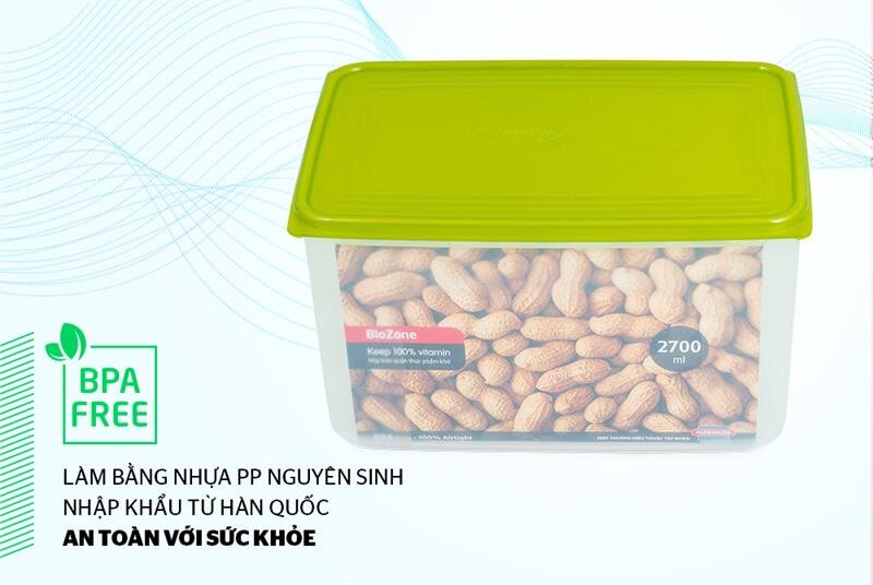 Hộp bảo quản thực phẩm khô BioZone 2700ml được làm bằng nhựa PP nhập khẩu từ Hàn Quốc. Đây là loại nhựa nguyên sinh cao cấp, chịu lực tốt, chịu nhiệt lên tới 100 độ C, không chứa chất gây ung thư BPA, có độ bền cao, kháng hóa chất và an toàn với sức khỏe. Nắp nhựa LDPE cao cấp