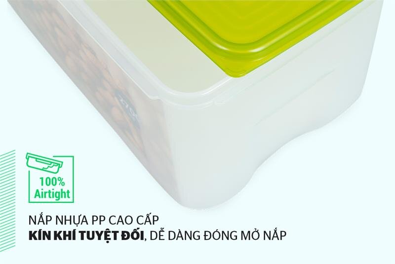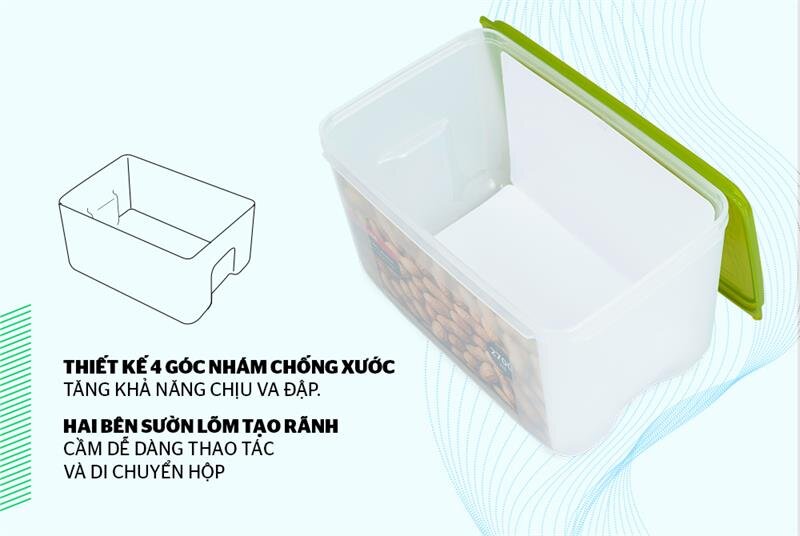 Nắp nhựa dẻo với độ co phù hợp, kín khít miệng hộp nên dù không có gioăng silicon thì vẫn kín khí tuyệt đối. Điều này vô cùng quan trọng trong việc bảo quản thực phẩm khô, các loại hạt… 4 góc nhám chống xước & thiết kế lõm hai bên sườn