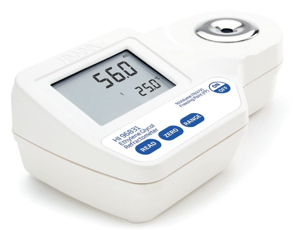 Máy đo khúc xạ kỹ thuật số sẽ giúp con người xác định khối lượng phần trăm và điểm đông của Ethylene Glycol. HI96831 dễ sử dụng để đo điểm đông và khối lượng phần trăm trong các dung dịch Ethylene Glycol tại nơi làm việc hoặc phòng thí nghiệm.