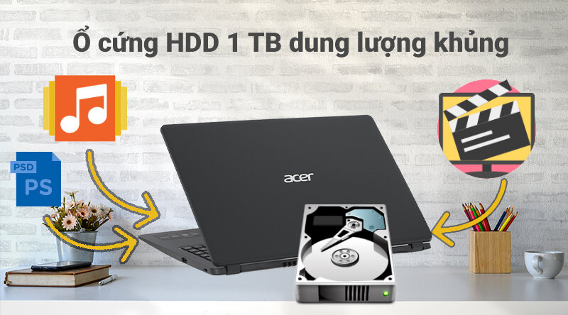 Laptop được trang bị ổ cứng HDD 1 TB, việc của bạn là tải các phần mềm, game giải trí nhẹ nhàng hay các bản nhạc, bộ phim yêu thích, việc lưu trữ đã có laptop Acer Aspire A315 54 558R lo thay bạn.