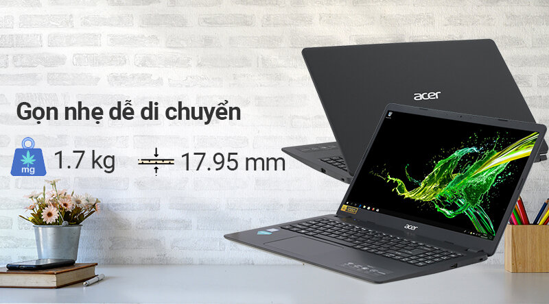 Thiết kế của laptop Acer Aspire A315 54 558R đơn giản nhưng không kém phần tinh tế, không những tối ưu về cân nặng mà còn tăng thêm sự sang trọng, hiện đại cho người dùng. Với trọng lượng 1.7 kg và độ dày 17.95 mm, sản phẩm này đáp ứng được tiêu chí gọn nhẹ. Việc di chuyển với người trợ thủ công nghệ mỏng nhẹ này trong mọi chuyến đi sẽ không còn là khó khăn.
