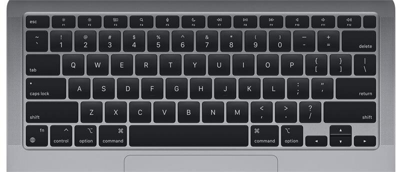 Bàn phím Magic Keyboard trên MacBook Air 2020 trang bị cơ chế cắt chéo cho bước phím chỉ 1mm. Có phím Esc vật lý và cụm phím mũi tên bố trí theo chữ "T" đảo ngược, kết hợp Touch ID, bàn phím Magic Keyboard này mang lại trải nghiệm đánh máy chính xác, thoải mái.