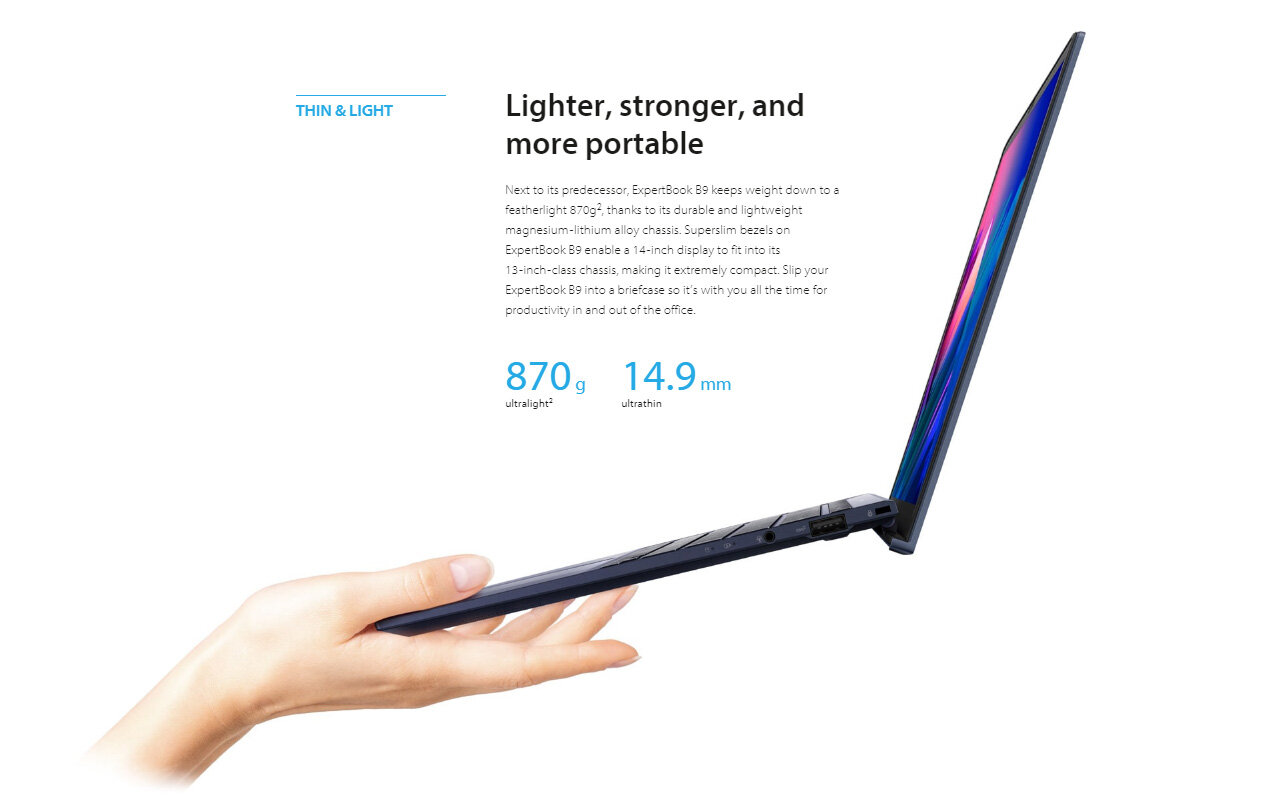 Trọng lượng của laptop B9400CEA chưa đầy 1kg – một con số cực kỳ ấn tượng, thiết kế này đặc biệt phù hợp với người dùng là doanh nhân, nhân viên văn phòng thường xuyên phải đi công tác. Nhờ bộ khung máy được chế tác từ nguyên liệu kim loại nhẹ Lithium-Magie đảm bảo độ cứng cáp, bền bỉ cho thiết bị mà vẫn mỏng nhẹ đáng kinh ngạc. Trải qua rất nhiều giai đoạn nghiên cứu và thử nghiệm ASUS mới cho ra mắt kiệt tác này, đảm bảo thu hút mọi ánh nhìn ngay từ lần đầu tiên.