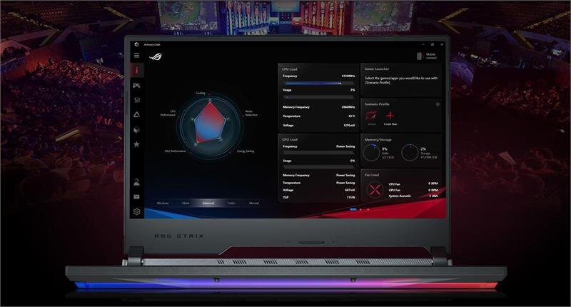 Bật ROG Armoury Crate chỉ bằng cách nhấn phím nóng, để xem màn hình điều khiển toàn diện. Hàng loạt thông tin hữu ích sẽ hiện ra như thông số CPU, GPU, nhiệt độ. Bạn có thể truy cập ROG GameFirst, GameVisual, Sonic Studio, Sonic Radar, Aura Core và XSplit Gamecaster. Đồng thời bạn còn có thể điều chỉnh cài đặt quạt tản nhiệt!