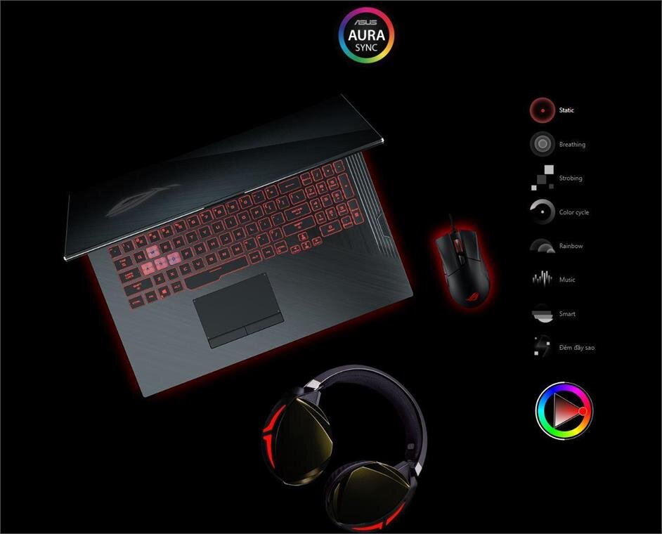 Công nghệ Aura Sync cho phép bạn trang hoàng cho Strix G G531GT-HN554T một diện mạo và cảm hứng đồng nhất. Đồng bộ hóa màu sắc của logo ROG, bàn phím và thanh sáng trên vỏ máy. Chuột, tai nghe gaming và các thiết bị ngoại vi khác được hỗ trợ Aura Sync cũng được đồng bộ. Bạn có thể dễ dàng điều khiển toàn phổ màu và bảy chế độ ánh sáng khác nhau thông qua bảng điều khiển Aura.