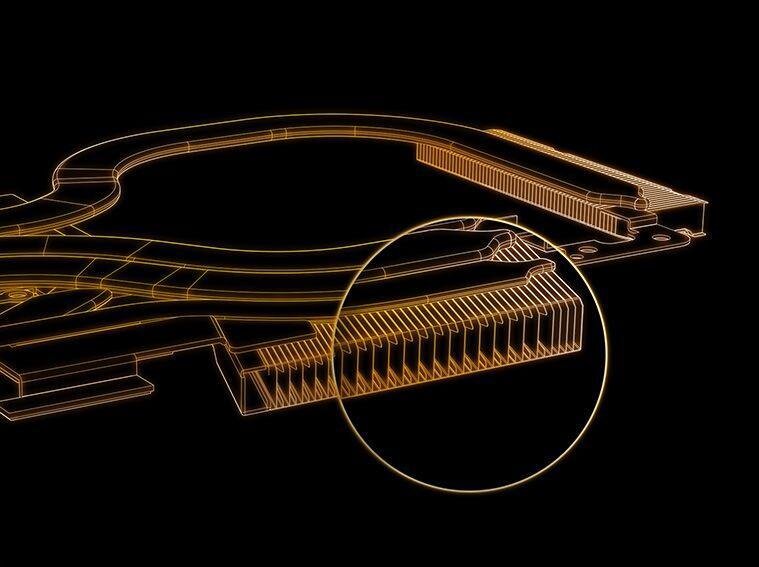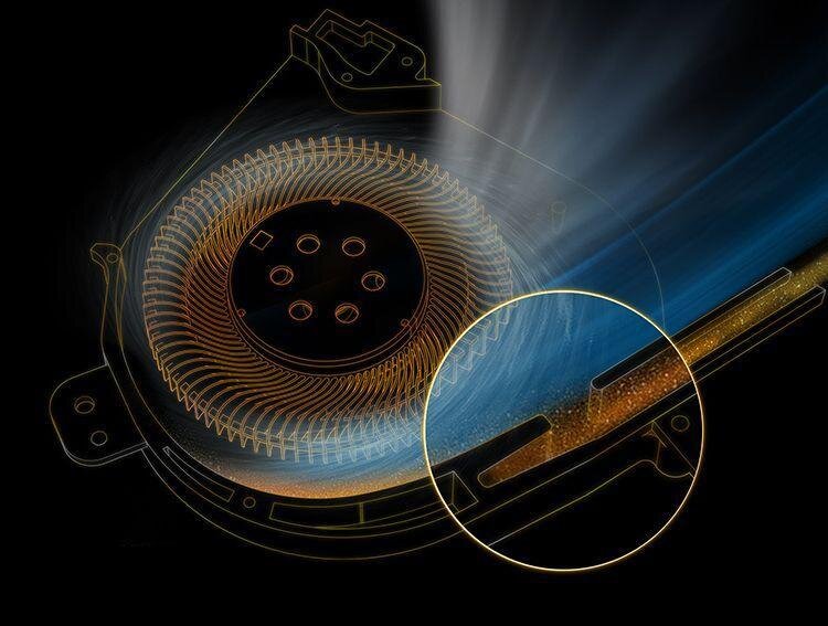 Tăng 22% lưu lượng khí lưu thông và hạ bớt 20% nhiệt độ so với hệ thống tản nhiệt thông thường. Mỗi bên tản được lót bằng vây đồng siêu mỏng, mỏng đến 0,1mm. Cho phép lưu thông không khí nhiều hơn và sức cản không khí thấp hơn so với máy thông thường. Có 83 cánh quạt trên mỗi quạt để tăng cường luồng khí lưu thông, đồng thời các lá tản nhiệt siêu mỏng giúp mở rộng diện tích bề mặt thoát nhiệt. Và ở hai bên tản nhiệt được đặt hướng về phía sau để hướng luồng không khí ấm ra khỏi bàn tay của bạn. Trong đó hệ thống tự động làm sạch sẽ giúp làm mát và đẩy bụi ra ngoài. ROG Armoury Crate phần mềm quản lý thông tin giúp bạn có thể tùy chỉnh tốc độ quạt.
