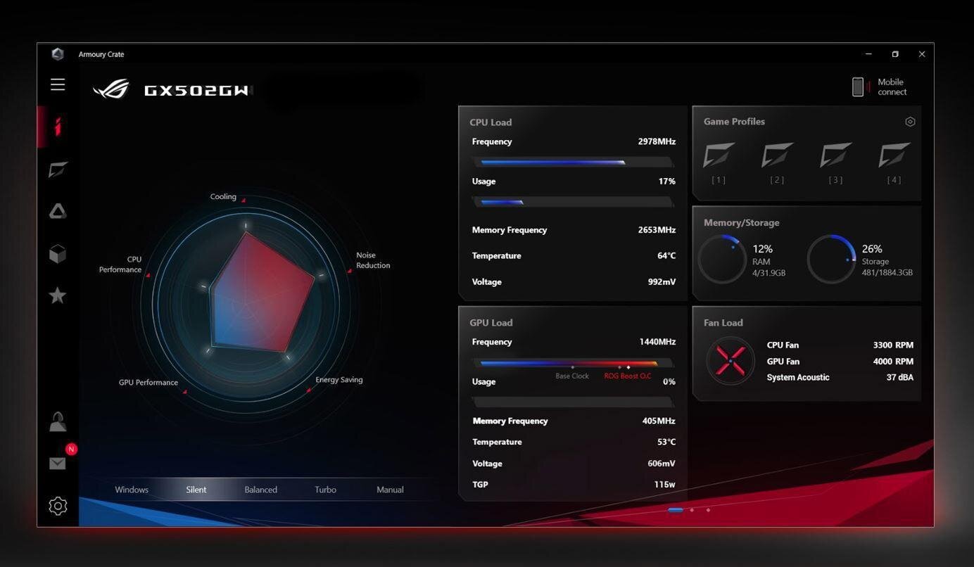 ROG Armory Crate giúp bạn đồng bộ mọi phần mềm và app, giúp bạn gia tăng trải nghiệm chơi game. Bạn có thể dễ dàng theo dõi và điều chỉnh các thông số cần thiết như: màu màn hình, thông số CPU, GPU. Điều chỉnh màu RGB bàn phím, điều chỉnh âm thanh, điều chỉnh băng thông. Bạn có thể hoàn toàn kiểm soát trải nghiệm chơi game của mình bằng ROG Armory Crate. Download app ROG Armory Crate để điều khiển mọi thông số trên qua smartphone ngay trong khi chơi game.
