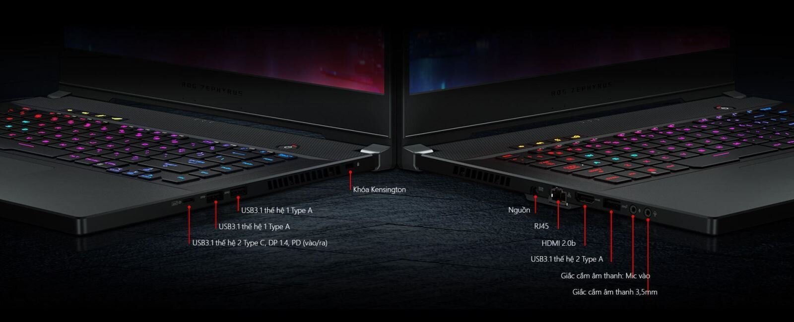 Zephyrus M GU502GU-AZ090T trang bị khả năng kết nối tối tân nhất mang lại cho bạn tốc độ truyền siêu nhanh và khả năng tương thích tối đa. USB 3.1 Gen 2 Type-C ™ với DisplayPort ™ 1.4. Cổng Type-A để truyền cực nhanh và hai cổng USB 3.1 Gen 1 hoàn hảo cho chuột và gamepad. Giải trí trên màn hình lớn với đầu ra HDMI 2.0 hỗ trợ 4K UHD ở tần số quét 60Hz. Wi-Fi 802.11ac truy cập trực tuyến nhanh chóng cho các hoạt động hàng ngày. Trong khi giắc cắm Gigabit Ethernet độ trễ thấp nhất trong mạng LAN. ROG ARMOURYCRATE