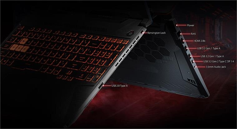 Asus TUF Gaming A15 FA506IU-AL127T được trang bị rất nhiều cổng kết nối, đảm bảo về tốc độ và trao đổi dữ liệu tới các thiết bị ngoại vi một cách dễ dàng. Các kết nối đa phần được trang bị ở cạnh bên trái của sản phẩm bao gồm: Cạnh trái: Nút cắm nguồn; jack cắm mạng LAN; cổng HDMI 2.0b; 2 x cổng USB 3.2 Type A Gen 1; 1 cổng USB 3.2 Gen 2 Type C tốc độ cao, hỗ trợ cổng DisplayPort 1.4 kết nối đa màn hình; jack cắm tai nghe 3.5mm. Ở cạnh phải: Được trang bị khóa Ken và 1 USB 2.0 Type A.
